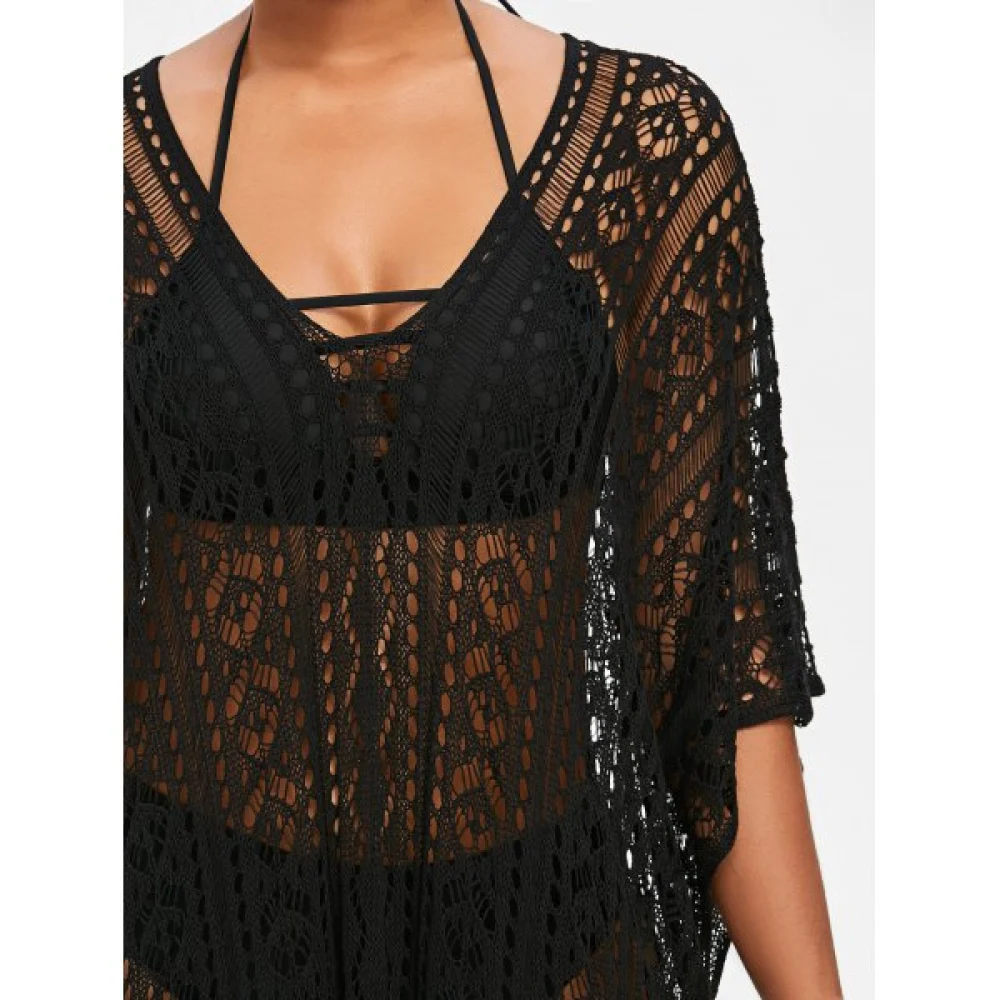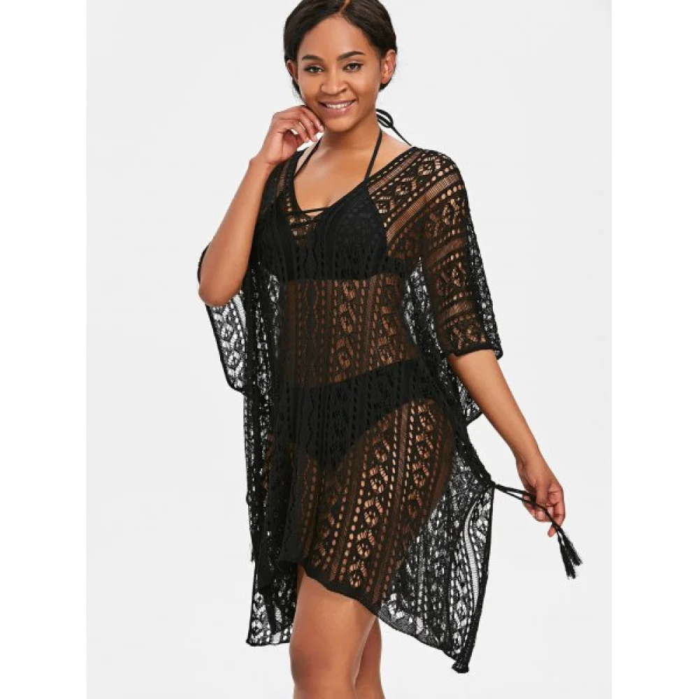 Show off your swimsuit with this flowy pullover knit cover up in asymmetrical loose-fit silhouette. Available in three colors. this kaftan cover up features openwork knit details all over. slit sides with lace-up straps. and 3/4 length sleeves to protect your arms from sunlight. A great piece that'll put you in a sunny mood on your next vacation.