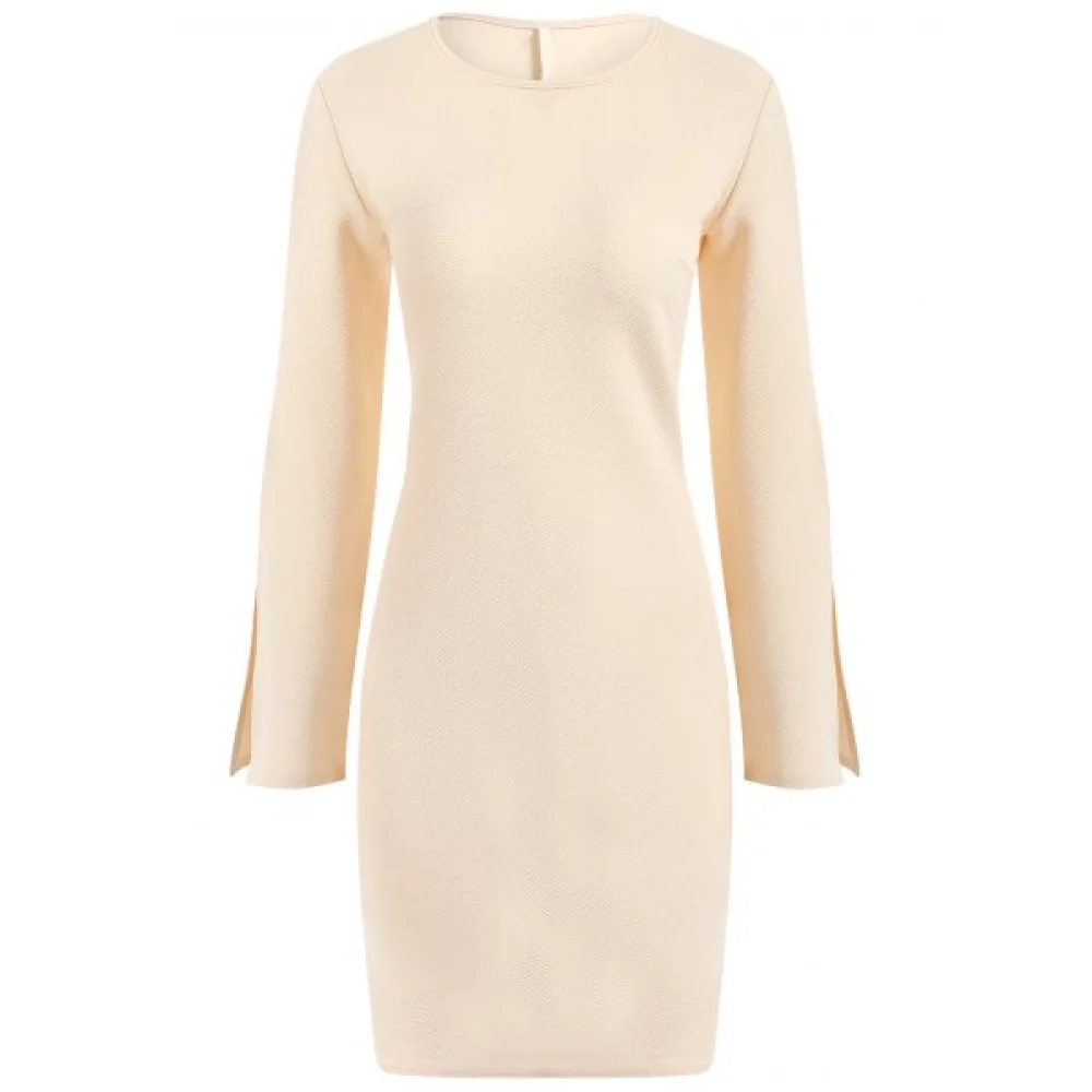 This dress has a nice thickness and comfy fabric. Mini length dress features basic round collar and long bell sleeves with split details at the sleeve cuffs. Simple and concise solid color design. Create the ultimate stylish look with a pair of heel.