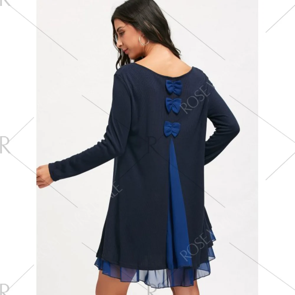 The long sleeve swing dress featuring chiffon panel and bowknot decorate. casual and female design. sweet and womanliness style. no restriction