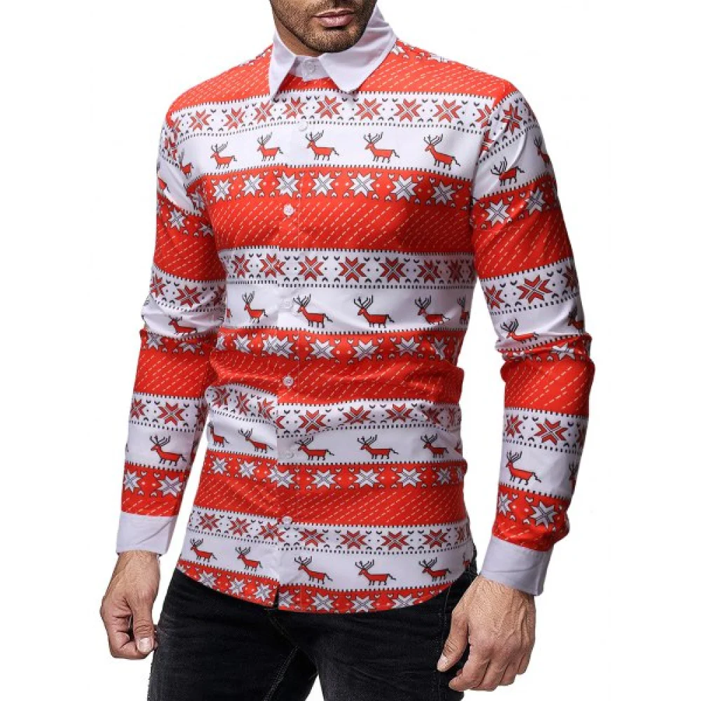 About Christmas Geometry Elk Print Long Sleeves Shirt - Red Fansmadedirect