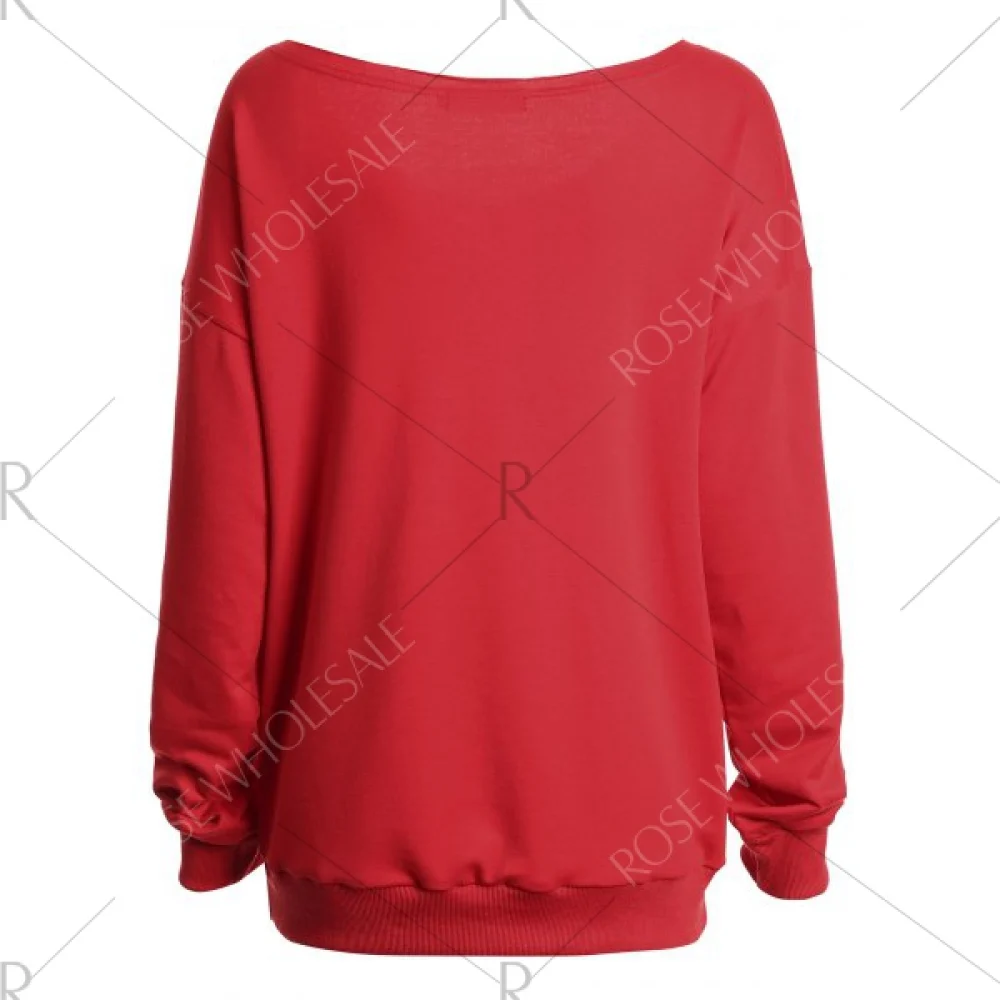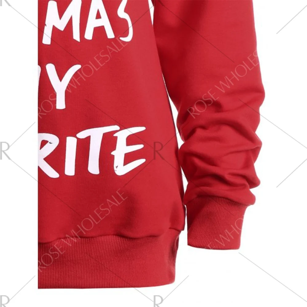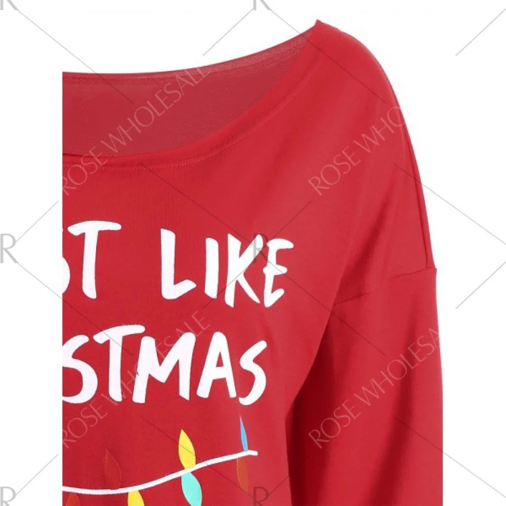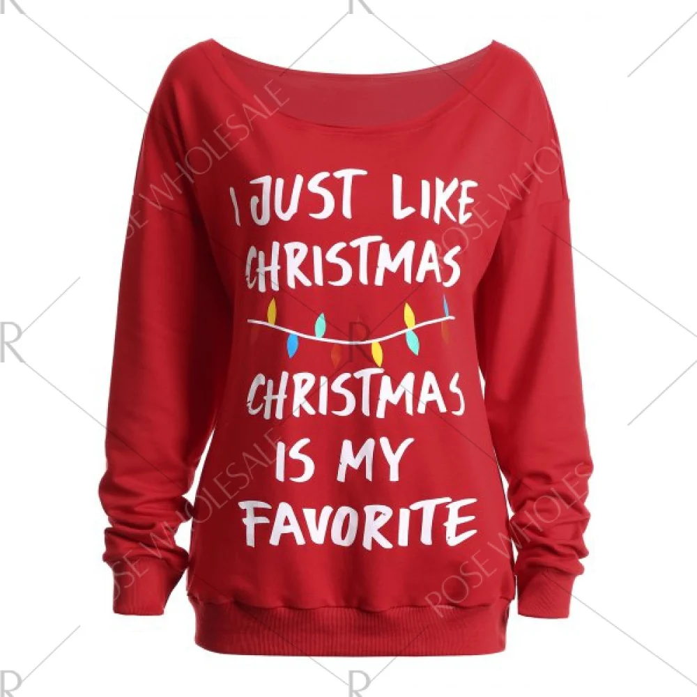 The sweatshirt has a personalized slogan: i just like Christmas. Christmas is my favorite. cute and fashionable design. the collar is big that you can choose expose one shoulder or not. combined with red color shows a active and festive look