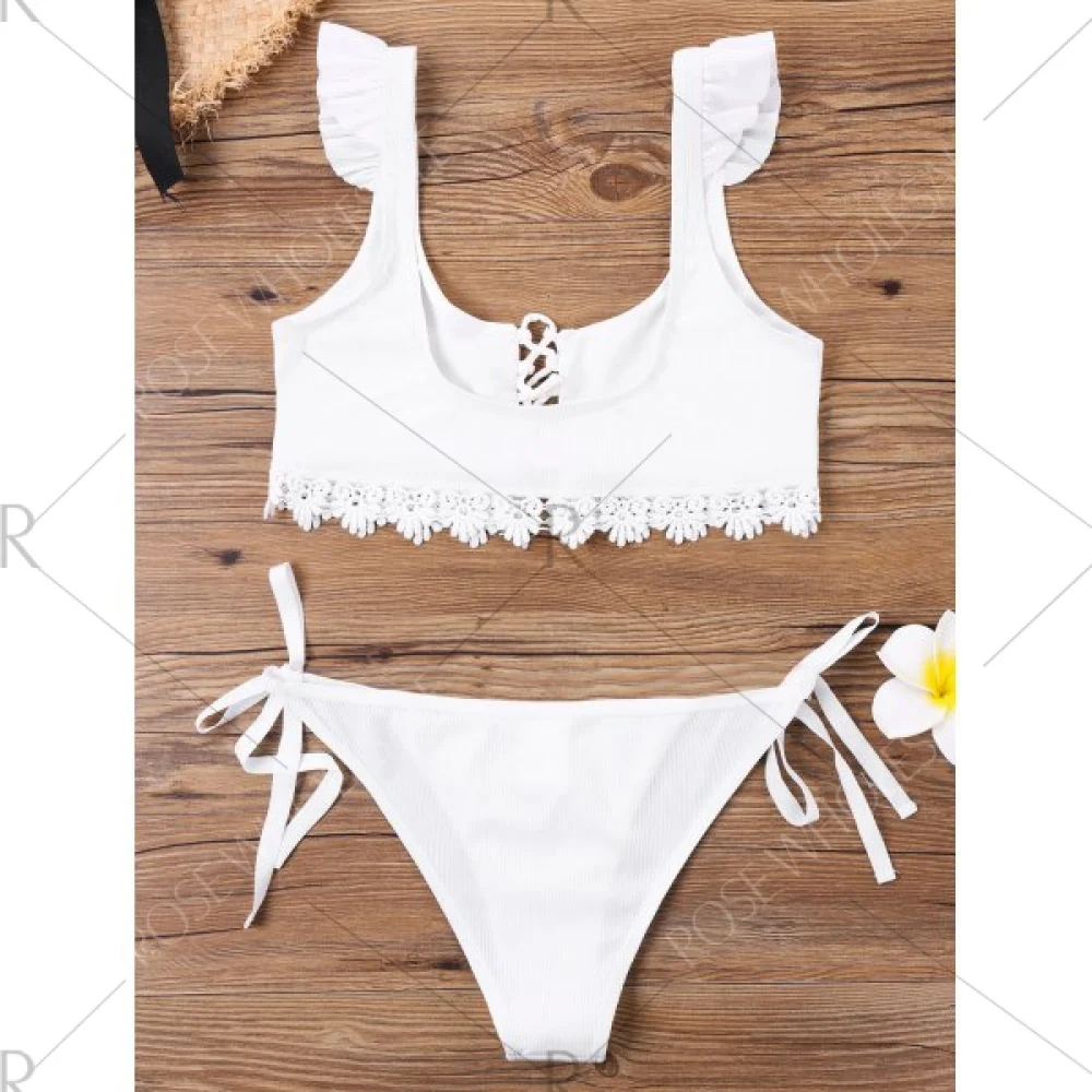 Simple sweet bikini suit is compose of criss-cross front. flower lace trim and ruffles straps crop bra top and tie side briefs. pull-on style.