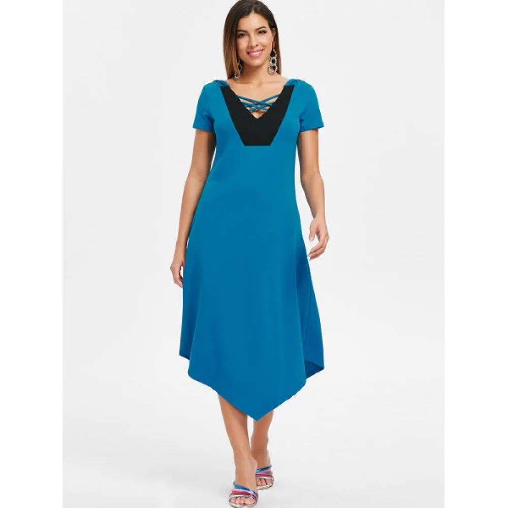 About Hooded Criss Cross Handkerchief Dress - acaw Blue Green Fansmadedirect