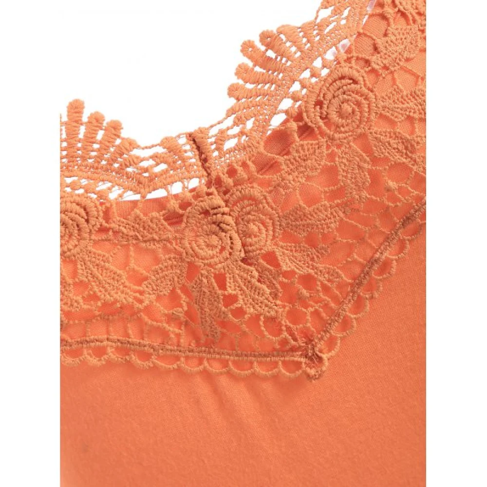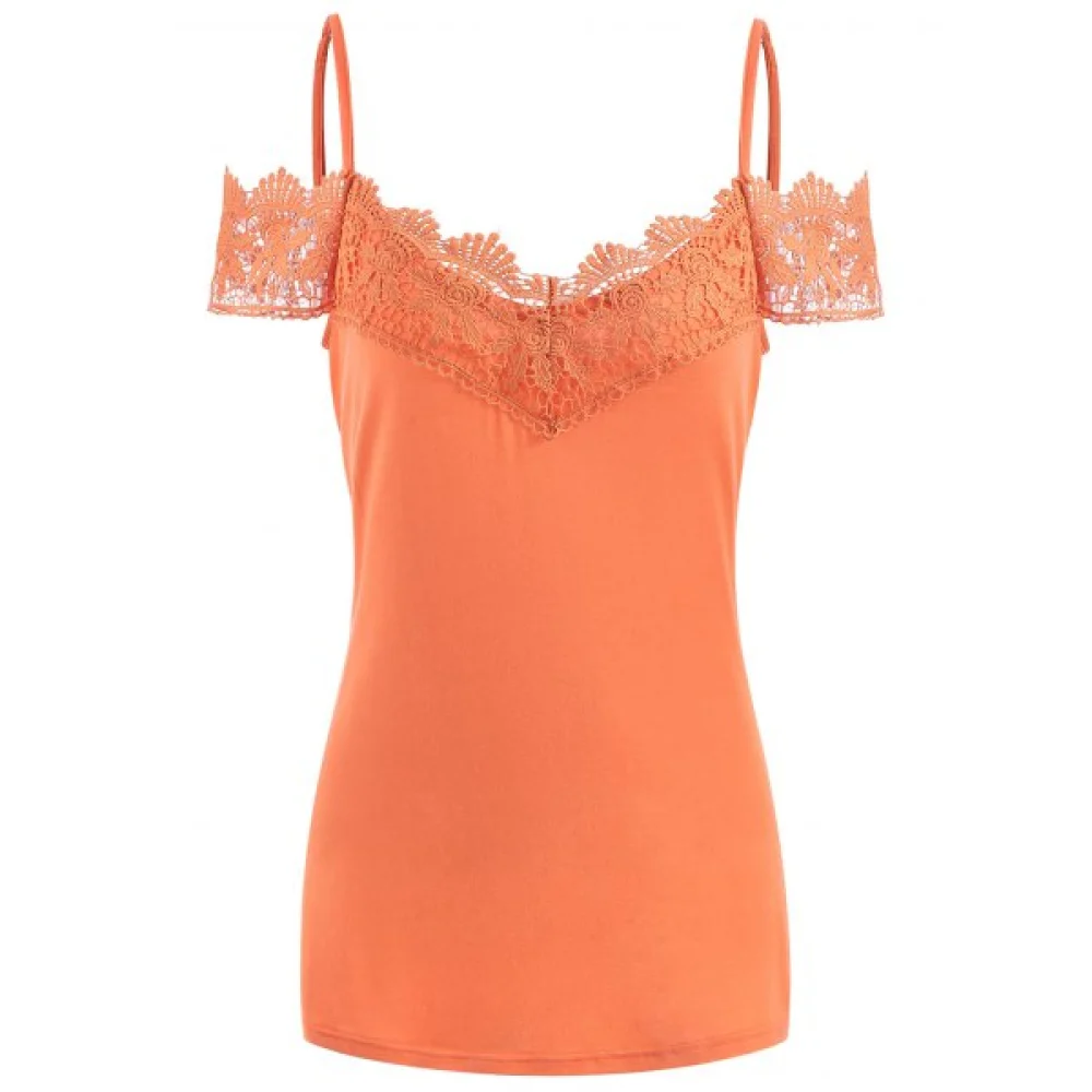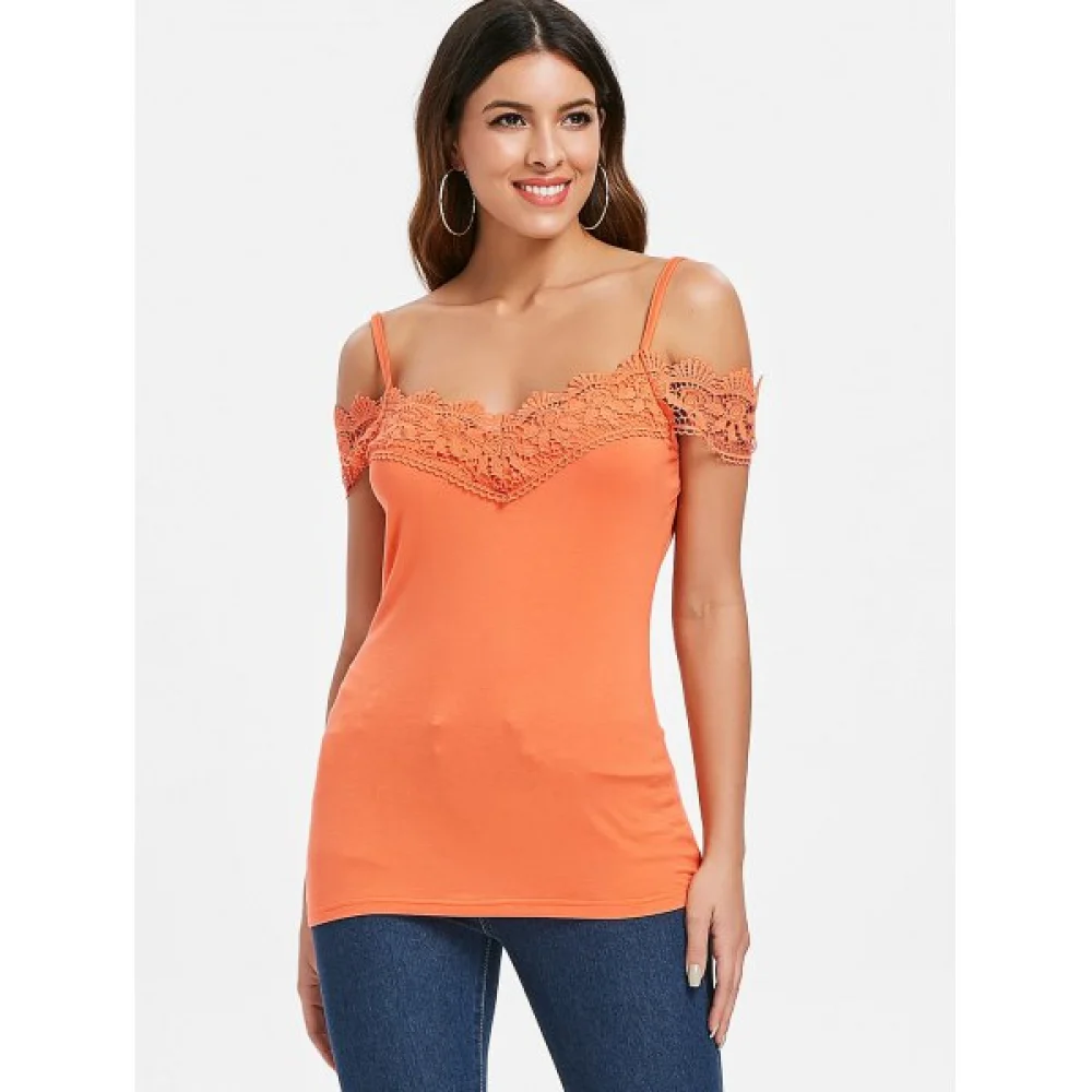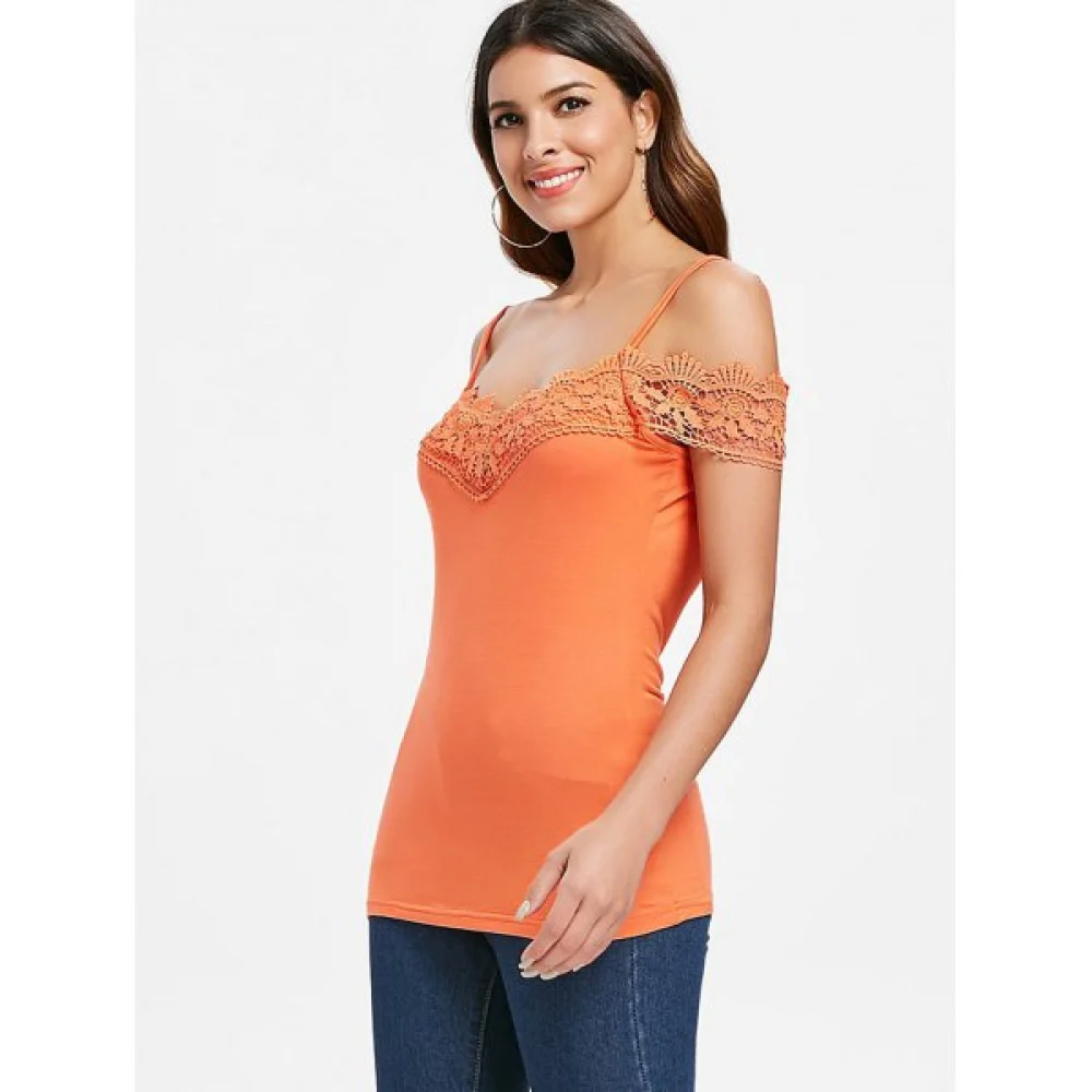 This casual T-shirt features the chic hollow-out lace fabric paneled the edge. cutout shoulder with the adjustable straps. and open back layout. Fitted silhouette. Soft and cozy to touch.