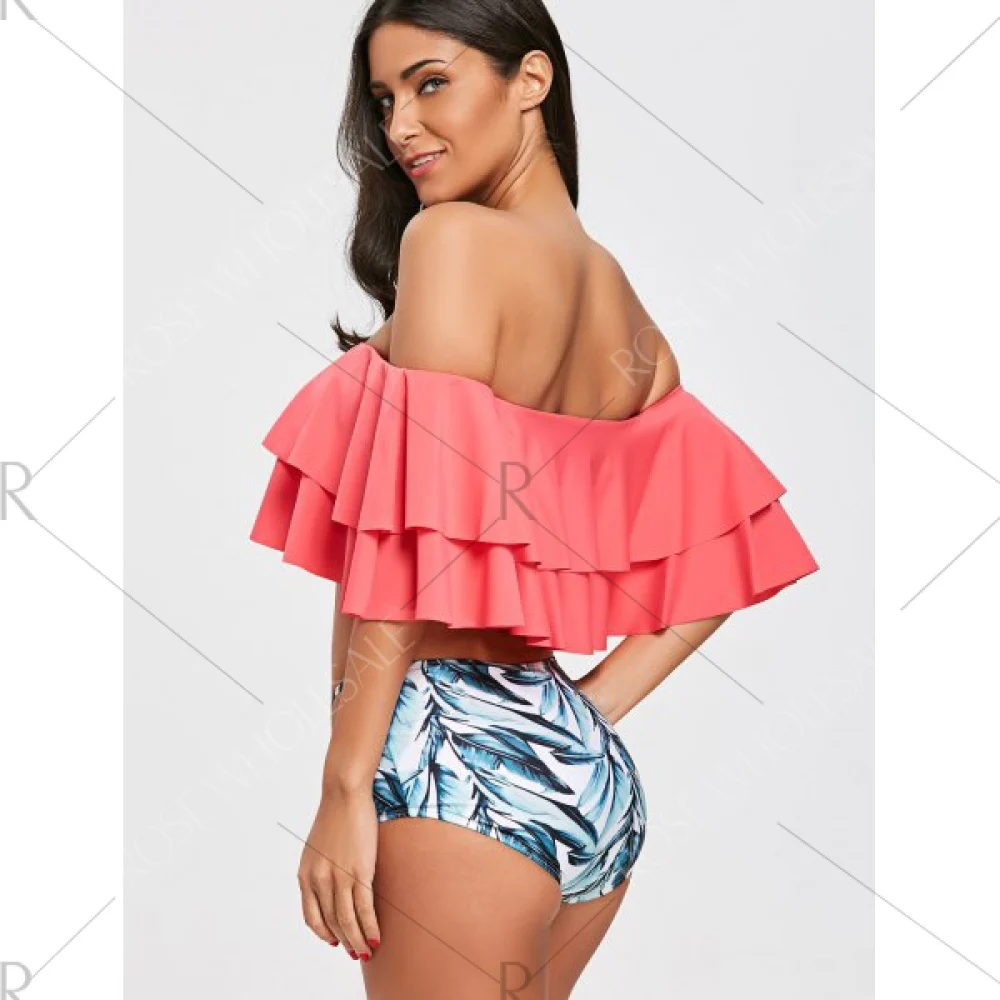 Nothing is important than having a wonderful bikini if you plan to go on a beach vacation. A suitable bikini can give you perfect wearing experience. and show your sexy body curve. This flounce bikini has an off the shoulder solid top features tier flounce. and a cheeky fit briefs detailed with leaves pattern and contrast cut out sides. Four colors are available that you can have more choices for your beachwear.