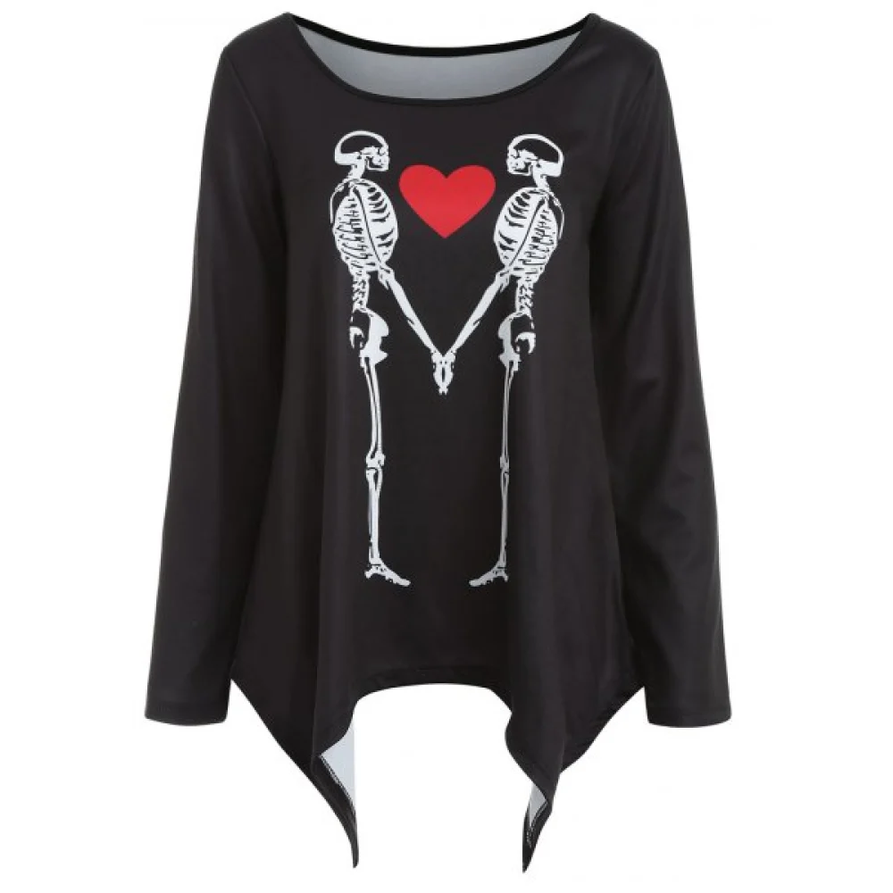 Featuring a lightweight and stretchy material. skeleton and heart print graphic. a trendy asymmetrical silhouette and long sleeves. this tee is perfect for giving your look a feminine Halloween touch. Team it with some jeans and heels for a fun and girly style.