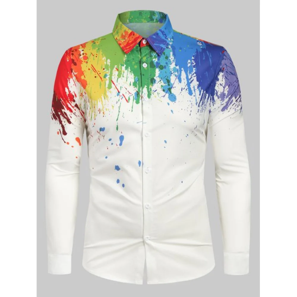 This shirt features colorful splatter painting print. frontal button closure. long sleeves. basic collar. and relaxed fit. Comfortable and easy to wear and it can give you a fair and fashion look. This shirt is a classic and fashion. a perfect mainstay in your closet. and it is suitable for all the year.
