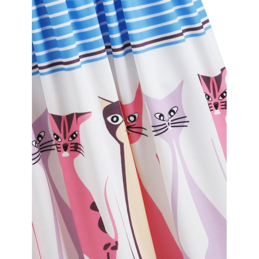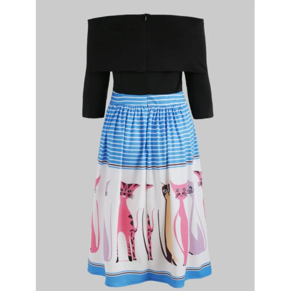 Vintage-style dress features an alluring off-the-shoulder neck with a ruffled overlay. 3/4 length sleeves. and concealed back zipper at bodice. while the skirt is full of cute stripes and cats print for added appeal. Wide waist design which shows off your slim figure perfectly. It is perfect for daily. ball. party. banquet and other special occasions.