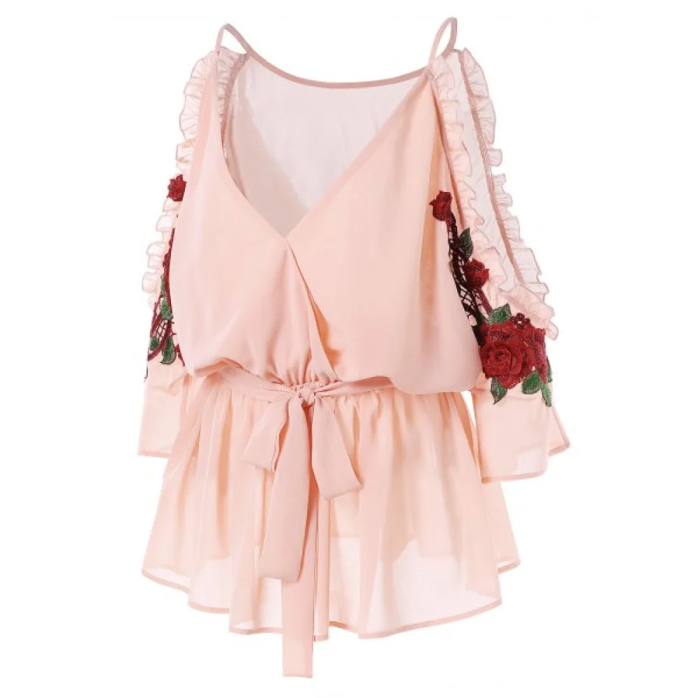 This sweet woman's blouse features cold shoulders with sweetly ruffled edges. sexy low cut design. floral embroidered appliques and a belted waist. in a faux wrap style. The soft chiffon material makes you feel at ease and shows female charm. Just style pants for a chic summer look!