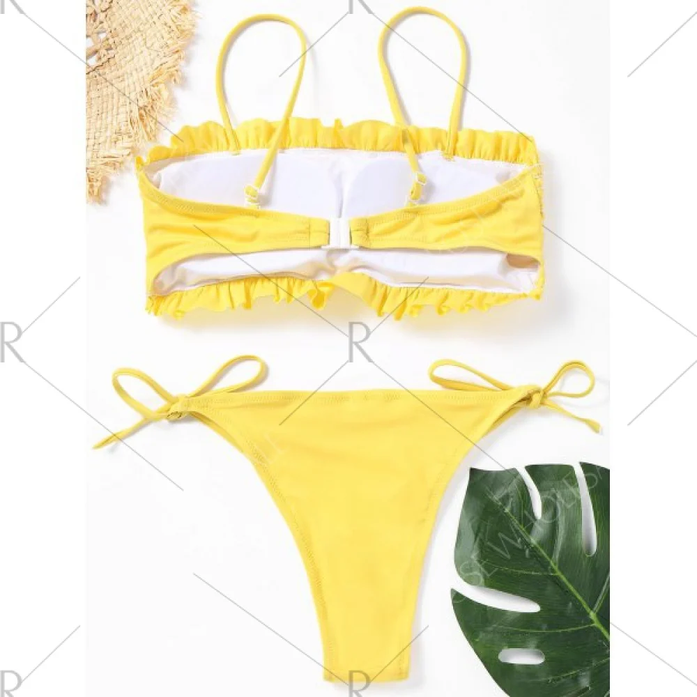 It's the sexy bandeau bikini set you've been on the hunt for. The bikini top is designed with shirred details. frill trims. and soft removable pads. Flirty low rise briefs is detailed with self tie sides. The top shoulder straps are adjustable for your perfect fit.