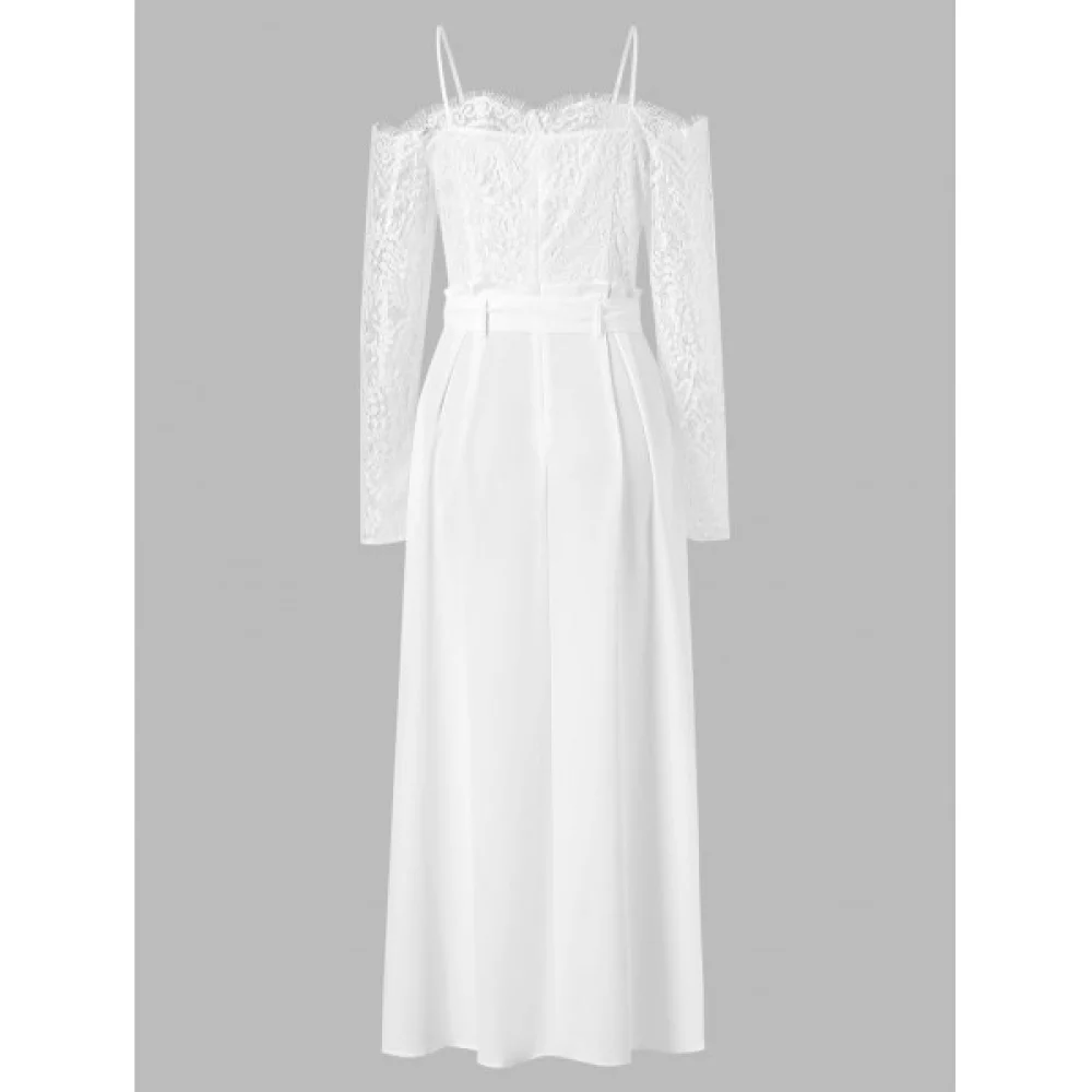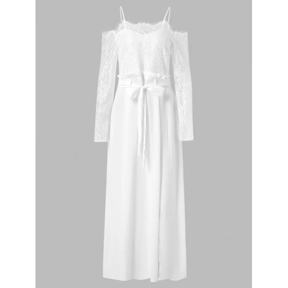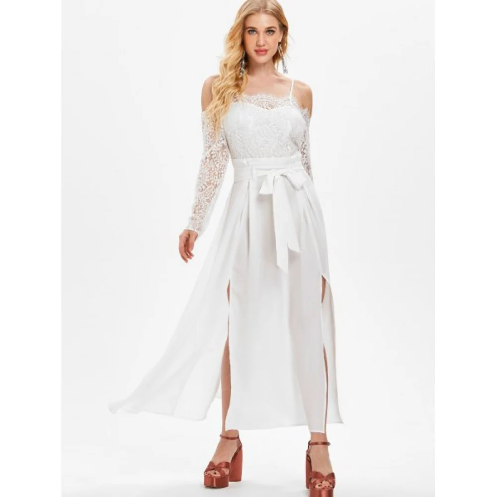 An elegant ladylike style with a waist-whittling tie belt defines the long-sleeved maxi dress to have for fall. featuring the lace overlay bodice with the shoulder-baring design. and the long flowing skirt with the splits. The belt loops are used to fix the belt. Hidden back-zip closure.