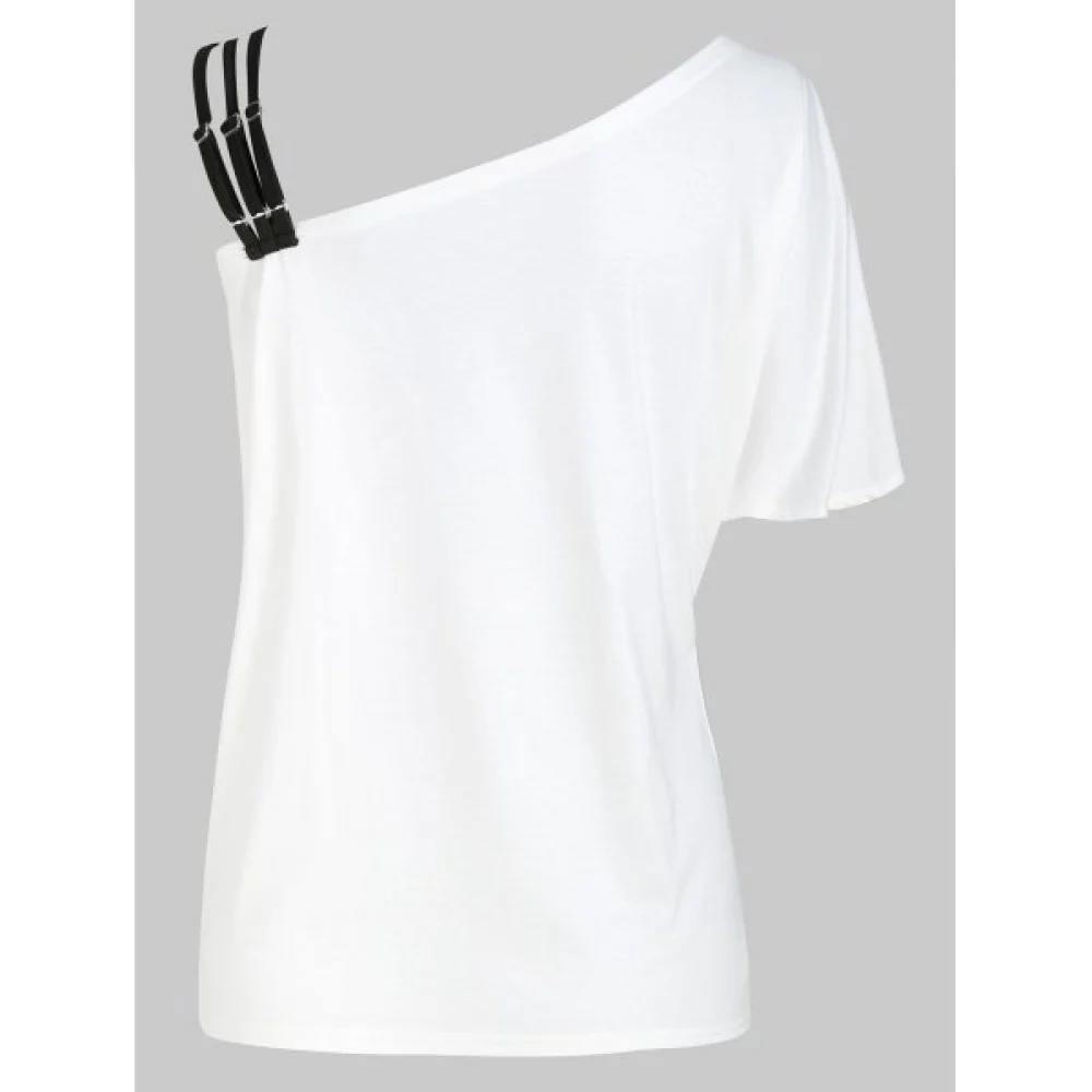 Add a little sexy element to your daily casual look with this skew neck t-shirt which flatters with one regular shoulder on one side. and a sleeveless design with three narrow straps on the other. And the front is printed with feather. moon. and beadings to offer an ethnic feeling.