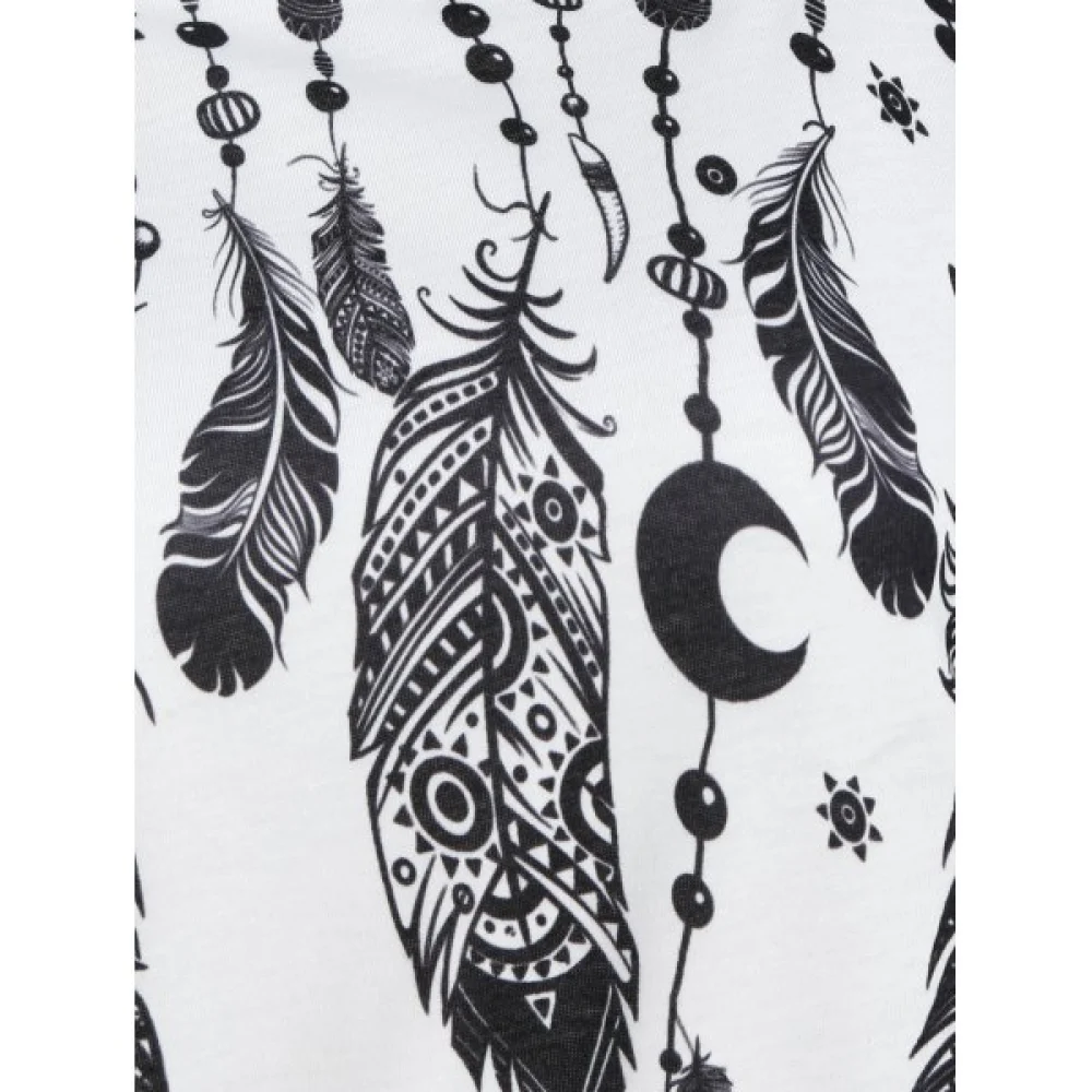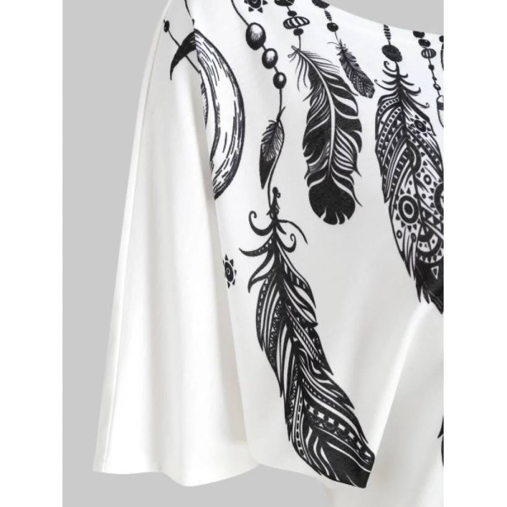 About Skew Neck Feather Print Short Sleeve T-shirt - White Fansmadedirect