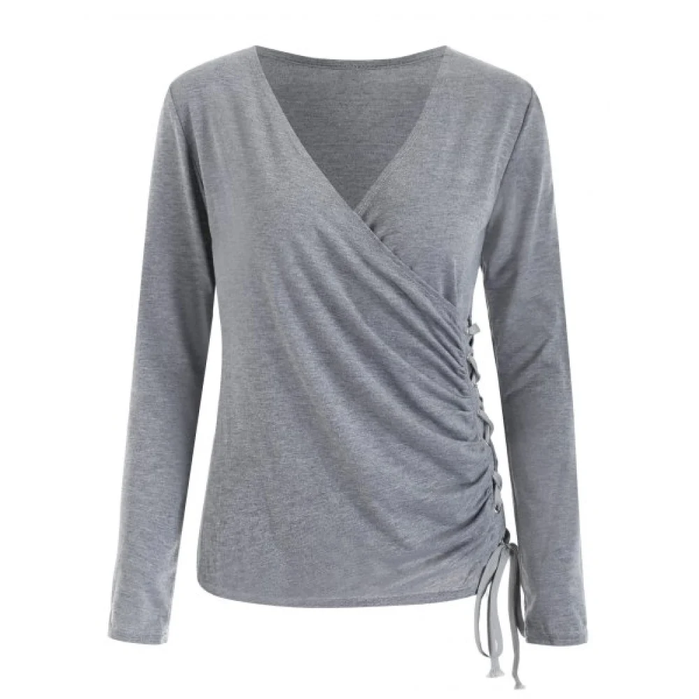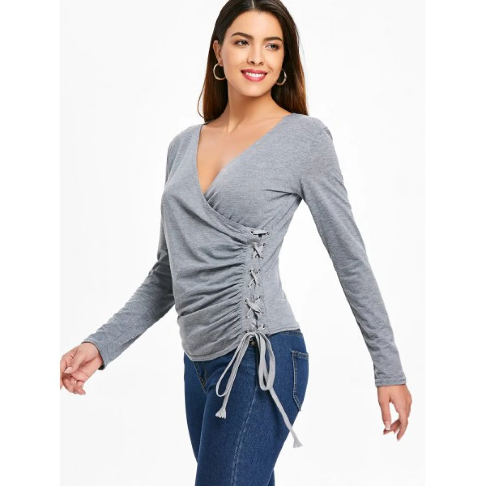 The top flatters any figure with a form-flattering cut with side lace-up detailing and long sleeves. Also. the low cut neckline gives it some eye-catching appeals. Comfy fabric with very soft hand feel. Pair it with jeans. leggings. or shorts. and you will look your best!