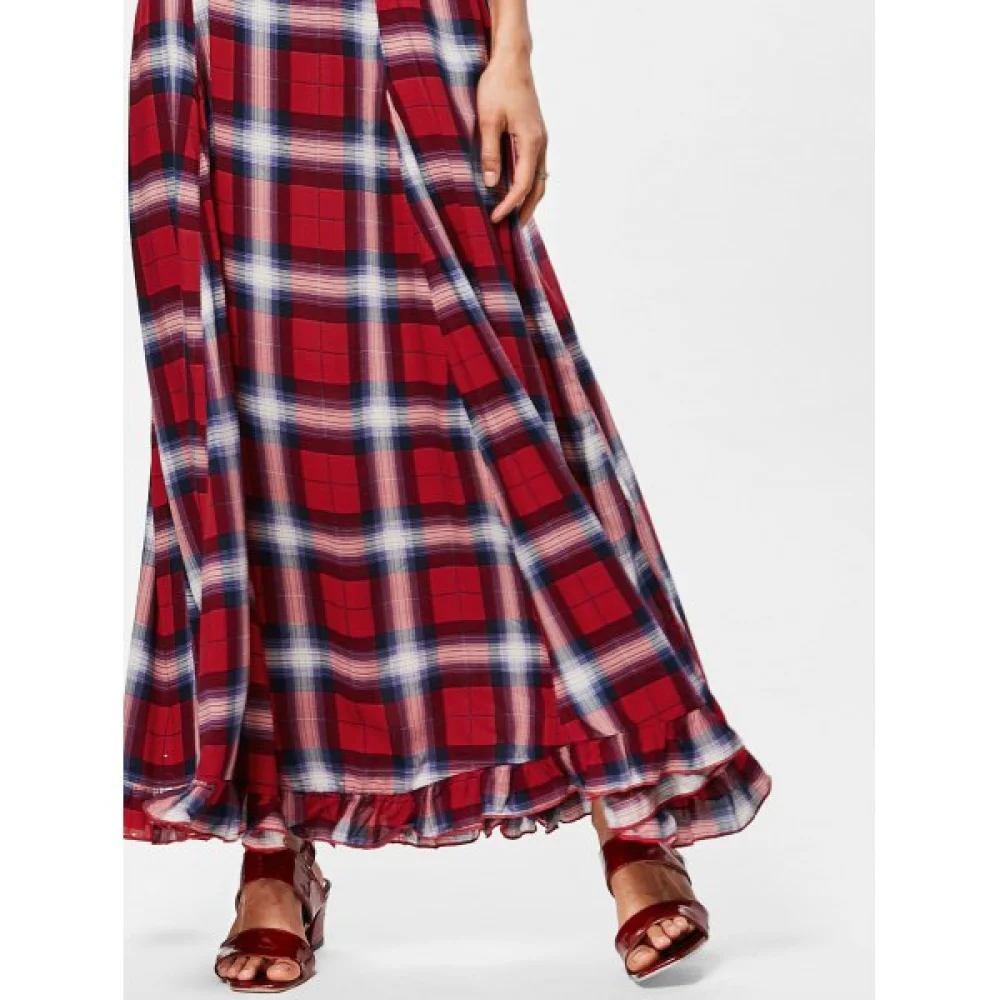 About Spaghetti Strap Plaid Long Dress - Red Wine Fansmadedirect