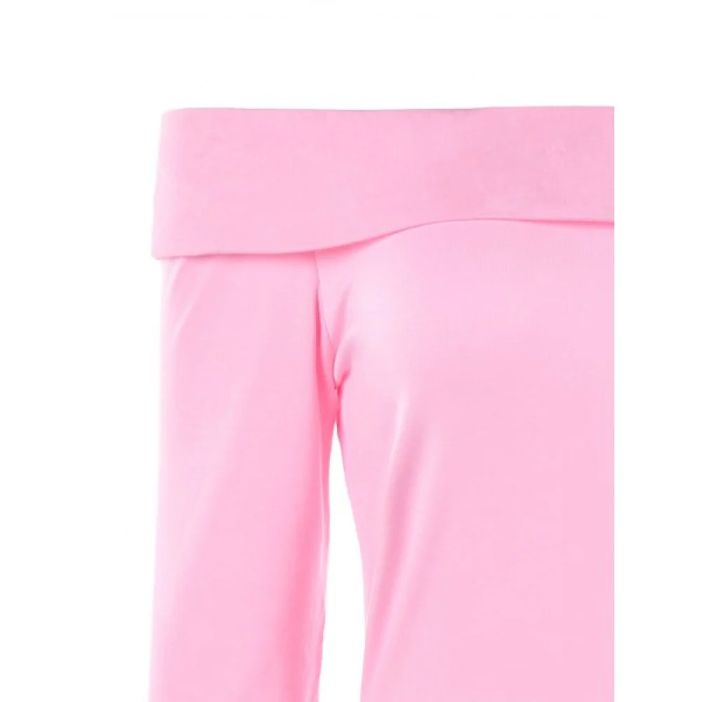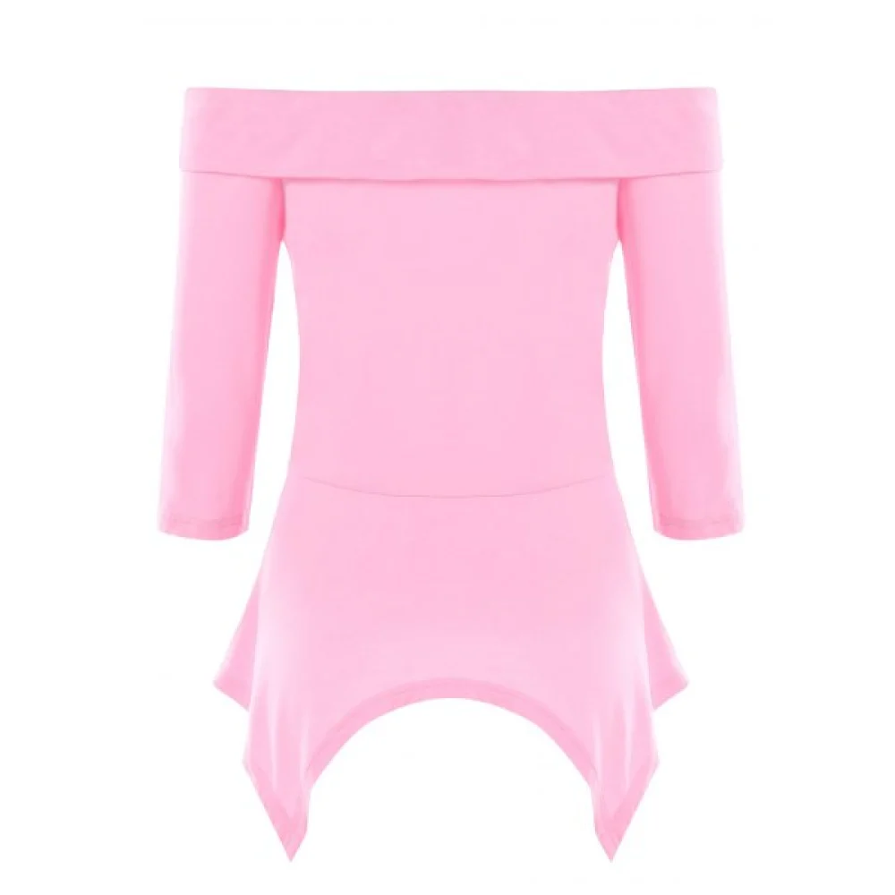 This light pink T-shirt features the off-the-shoulder layout with the fold-over design to soften the shoulder line. separate front to intercross and form an asymmetric peplum design. and fitted silhouette. Soft and cozy cotton blendeds fabric.